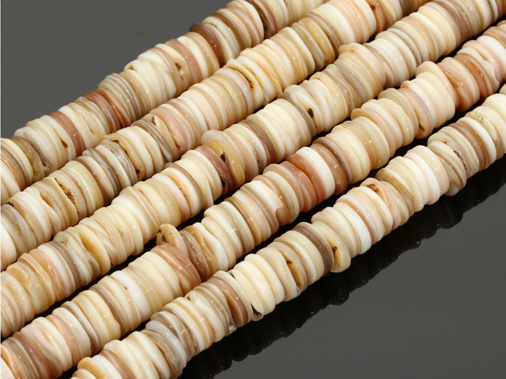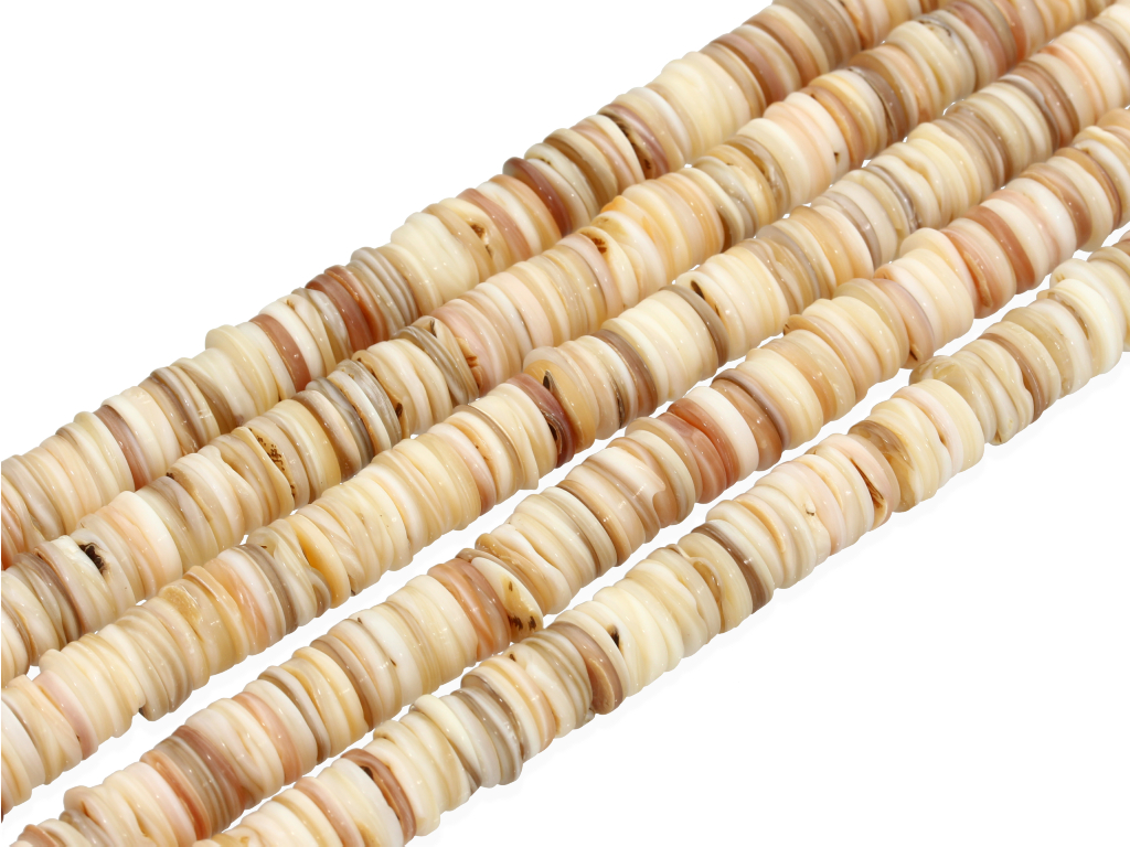 Muszla w kształcie plasterków, sprzedawana w sznurach bez zapięcia, służących do samodzielnego tworzenia biżuterii. Cena dotyczy jednego sznura, który podczas kompletowania zamówienia jest wybierany losowo.