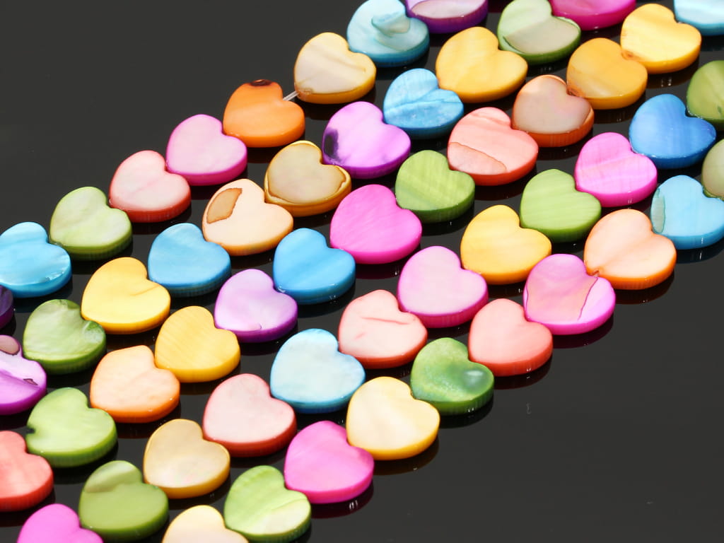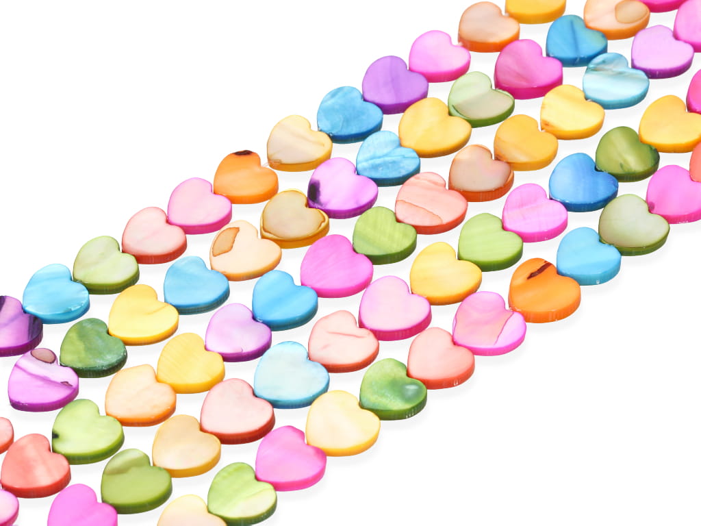 Muszla w kształcie serca, sprzedawana w sznurach bez zapięcia, służących do samodzielnego tworzenia biżuterii. Cena dotyczy jednego sznura, który podczas kompletowania zamówienia jest wybierany losowo.