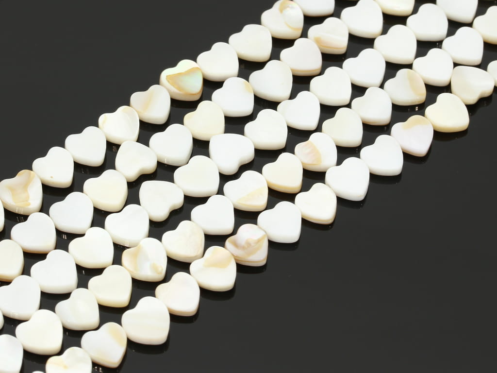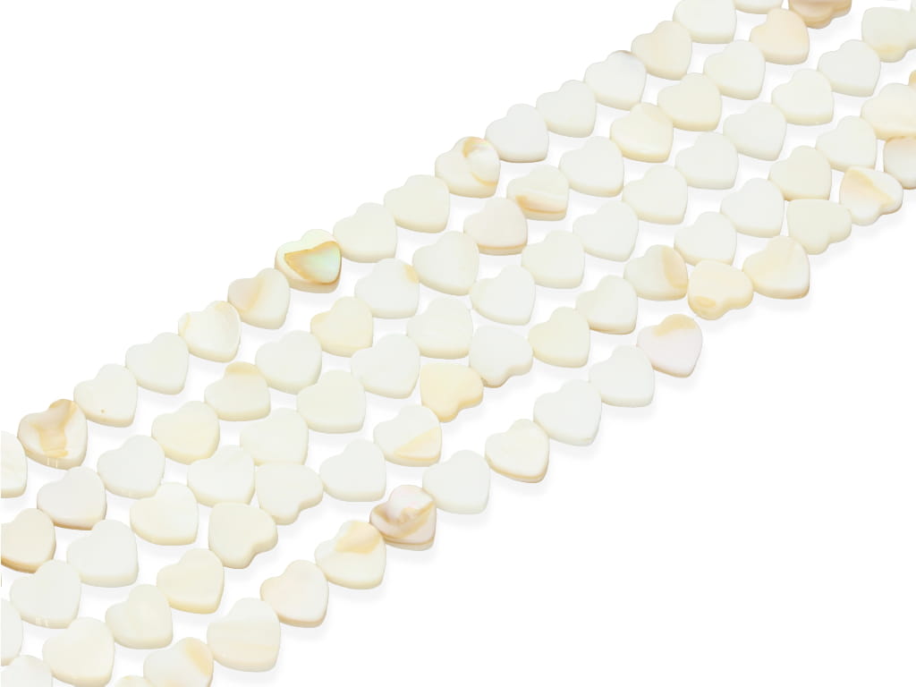 Muszla w kształcie serca, sprzedawana w sznurach bez zapięcia, służących do samodzielnego tworzenia biżuterii. Cena dotyczy jednego sznura, który podczas kompletowania zamówienia jest wybierany losowo.