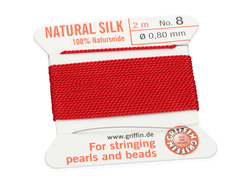 Wysokiej jakości nici jedwabne zakończone igłą ułatwiającą nawlekanie. Świetnie sprawdzą się jako nośnik do bransoletki lub naszyjnika wykonanego z pereł lub minerałów.