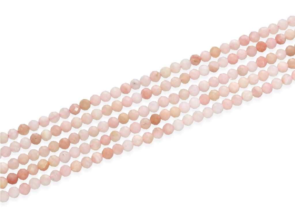 Opal różowy (andyjski) w kształcie fasetowanej kulki, sprzedawany w sznurach bez zapięcia, służących do samodzielnego tworzenia biżuterii. Cena dotyczy jednego sznura, który podczas kompletowania zamówienia jest wybierany losowo.