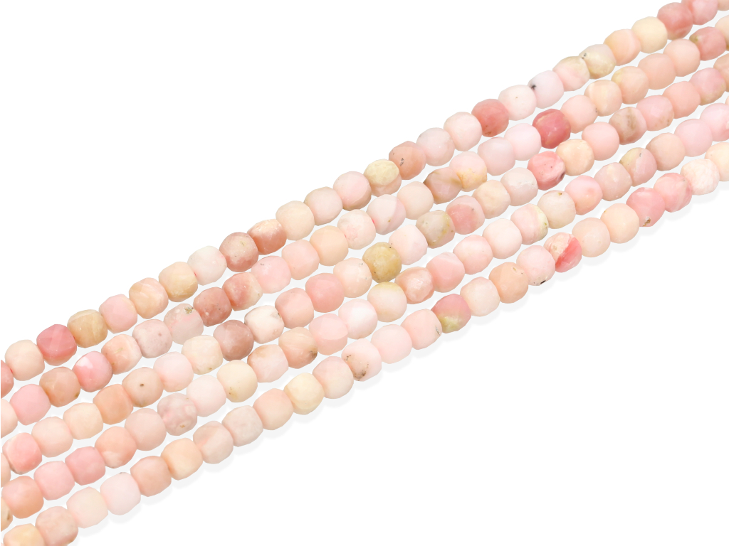 Opal różowy w kształcie fasetowanej kostki, sprzedawany w sznurach bez zapięcia, służących do samodzielnego tworzenia biżuterii. Cena dotyczy jednego sznura, który podczas kompletowania zamówienia jest wybierany losowo.