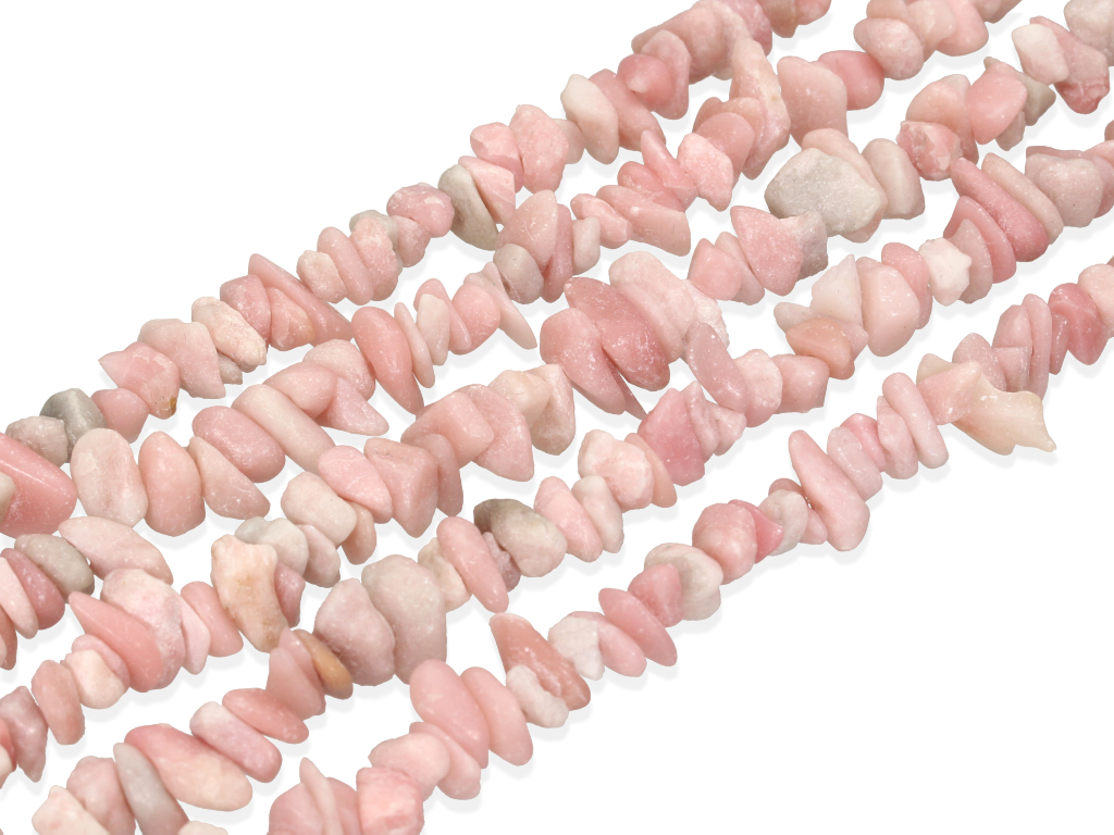 Naturalny opal różowy w kształcie sieczki, sprzedawany w sznurach bez zapięcia, służących do samodzielnego tworzenia biżuterii. Cena dotyczy jednego sznura o długości ~ 19cm, który podczas kompletowania zamówienia jest wybierany losowo.