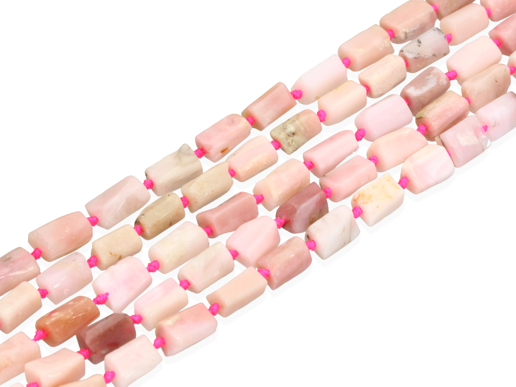 Opal różowy (andyjski) w kształcie ciosanego walca, sprzedawany w sznurach bez zapięcia, służących do samodzielnego tworzenia biżuterii. Cena dotyczy jednego sznura, który podczas kompletowania zamówienia jest wybierany losowo.