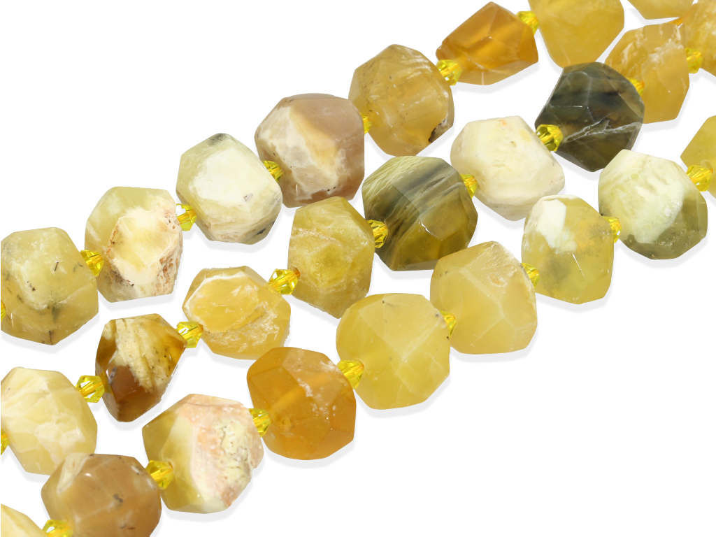 Opal żółty w kształcie nieregularnej, ciosanej bryłki, sprzedawany w sznurach bez zapięcia, służących do samodzielnego tworzenia biżuterii. Cena dotyczy jednego sznura o długości ~ 19cm, który podczas kompletowania zamówienia jest wybierany losowo.