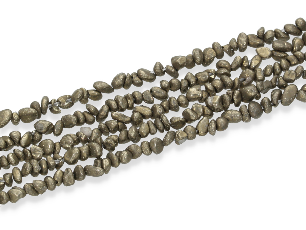 Polerowany piryt o nieregularnym kształcie, sprzedawany w sznurach bez zapięcia, służących do samodzielnego tworzenia biżuterii. Cena dotyczy jednego sznura o długości ~ 20 cm, który podczas kompletowania zamówienia jest wybierany losowo.