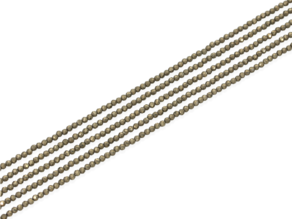 Piryt w kształcie fasetowanej kulki, sprzedawany w sznurach bez zapięcia, służących do samodzielnego tworzenia biżuterii. Cena dotyczy jednego sznura, który podczas kompletowania zamówienia jest wybierany losowo.
