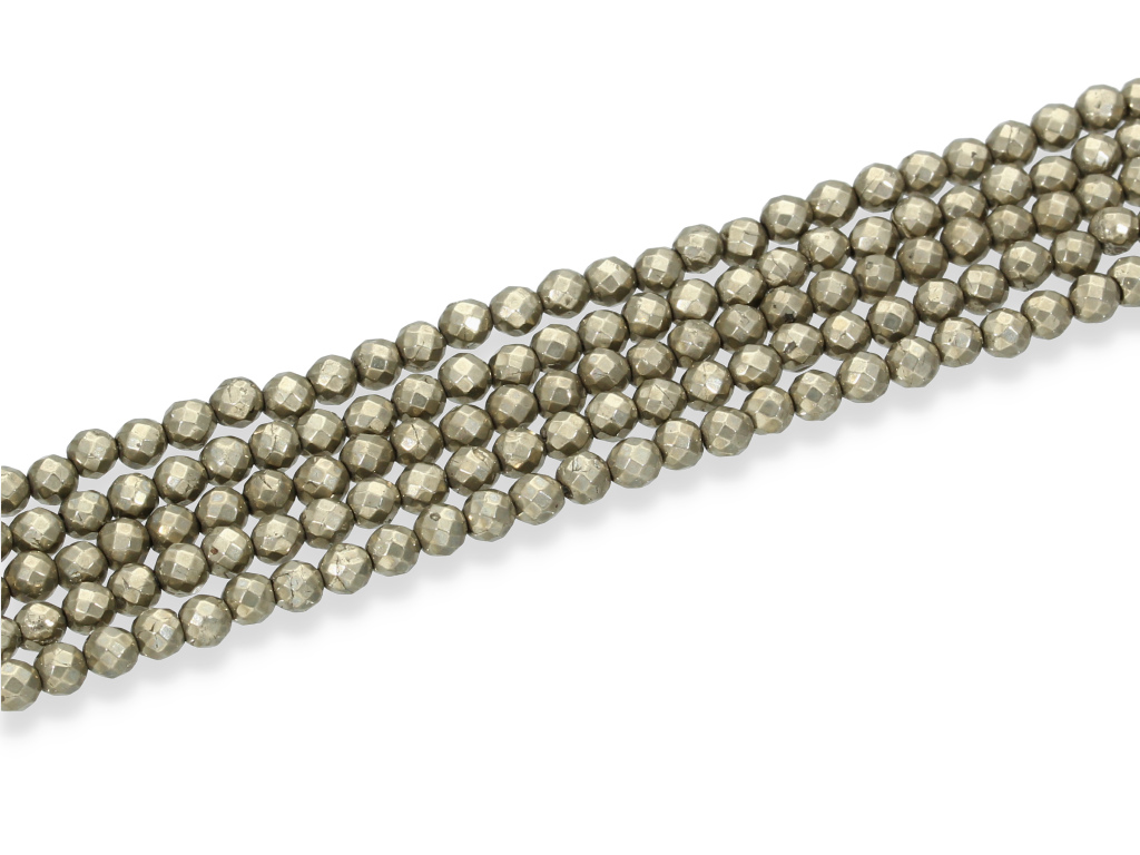 Piryt w kształcie fasetowanej kulki, sprzedawany w sznurach bez zapięcia, służących do samodzielnego tworzenia biżuterii. Cena dotyczy jednego sznura, który podczas kompletowania zamówienia jest wybierany losowo.