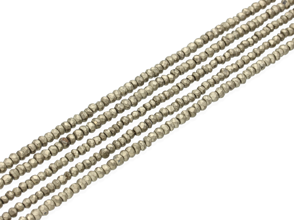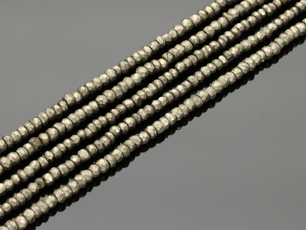 Piryt gradacji jakościowej BBB w kształcie fasetowanej oponki, sprzedawany w sznurach bez zapięcia, służących do samodzielnego tworzenia biżuterii. Cena dotyczy jednego sznura, który podczas kompletowania zamówienia jest wybierany losowo.