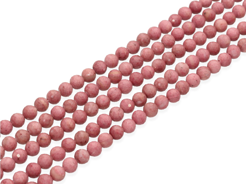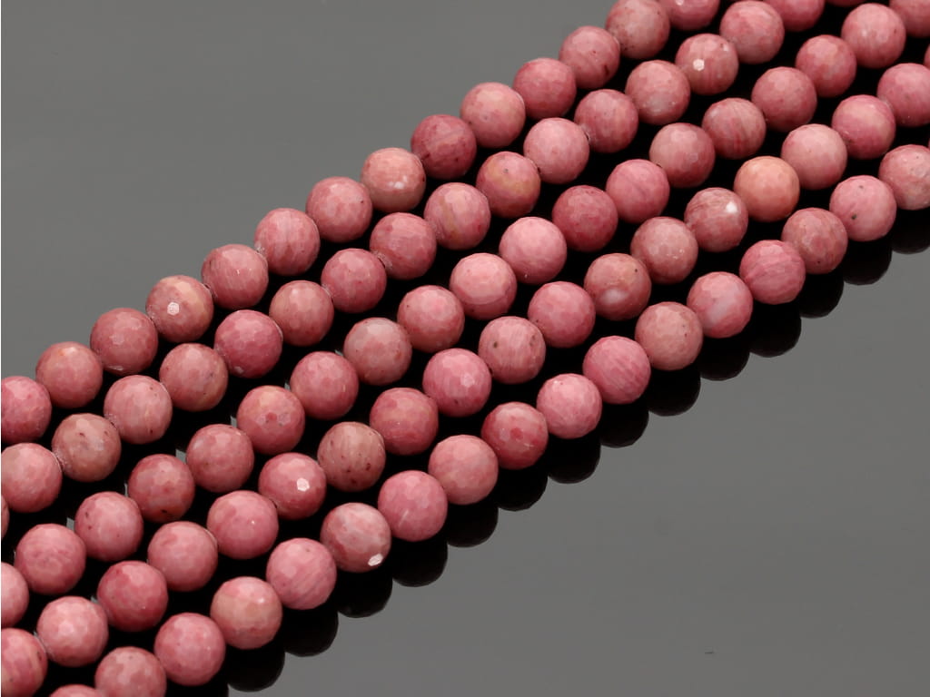 Rodochrozyt w kształcie fasetowanej kulki, sprzedawany w sznurach bez zapięcia, służących do samodzielnego tworzenia biżuterii. Cena dotyczy jednego sznura, który podczas kompletowania zamówienia jest wybierany losowo.