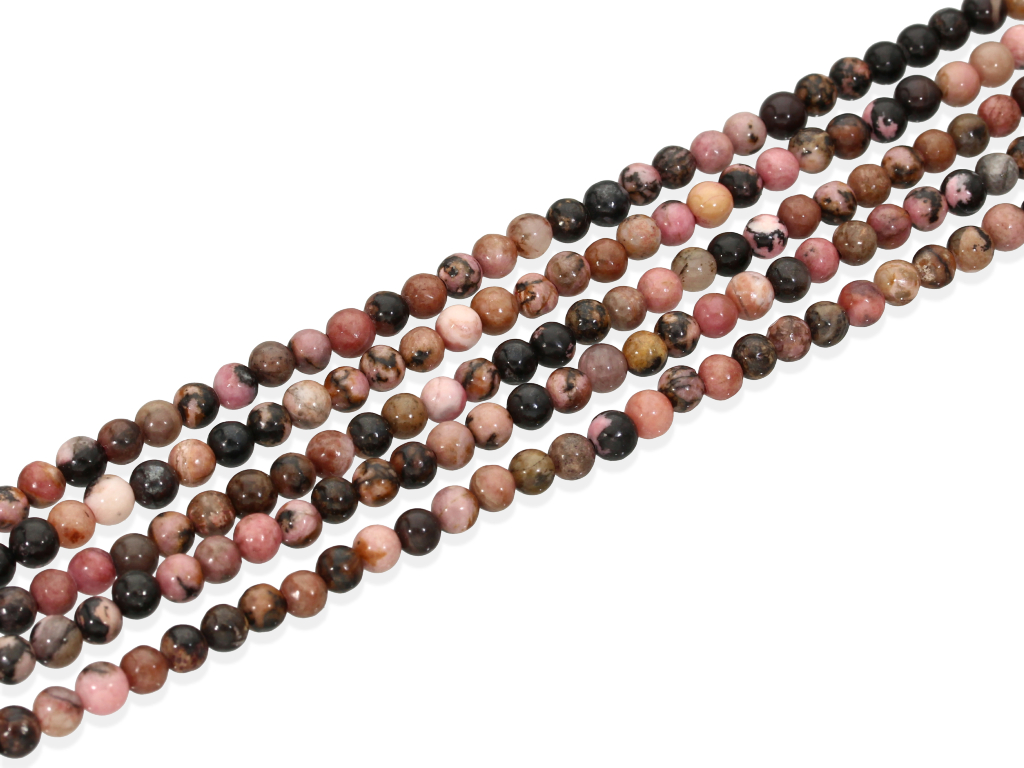 Rodonit w kształcie kulki, sprzedawany w sznurach bez zapięcia, służących do samodzielnego tworzenia biżuterii. Cena dotyczy jednego sznura, który podczas kompletowania zamówienia jest wybierany losowo.