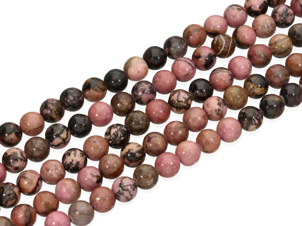 Rodonit w kształcie kulki, sprzedawany w sznurach bez zapięcia, służących do samodzielnego tworzenia biżuterii. Cena dotyczy jednego sznura, który podczas kompletowania zamówienia jest wybierany losowo.