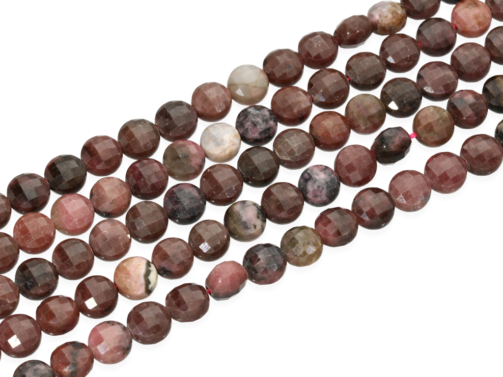 Rodonit w kształcie fasetowanej pastylki, sprzedawany w sznurach bez zapięcia, służących do samodzielnego tworzenia biżuterii. Cena dotyczy jednego sznura o długości ~ 20 cm, który podczas kompletowania zamówienia jest wybierany losowo.