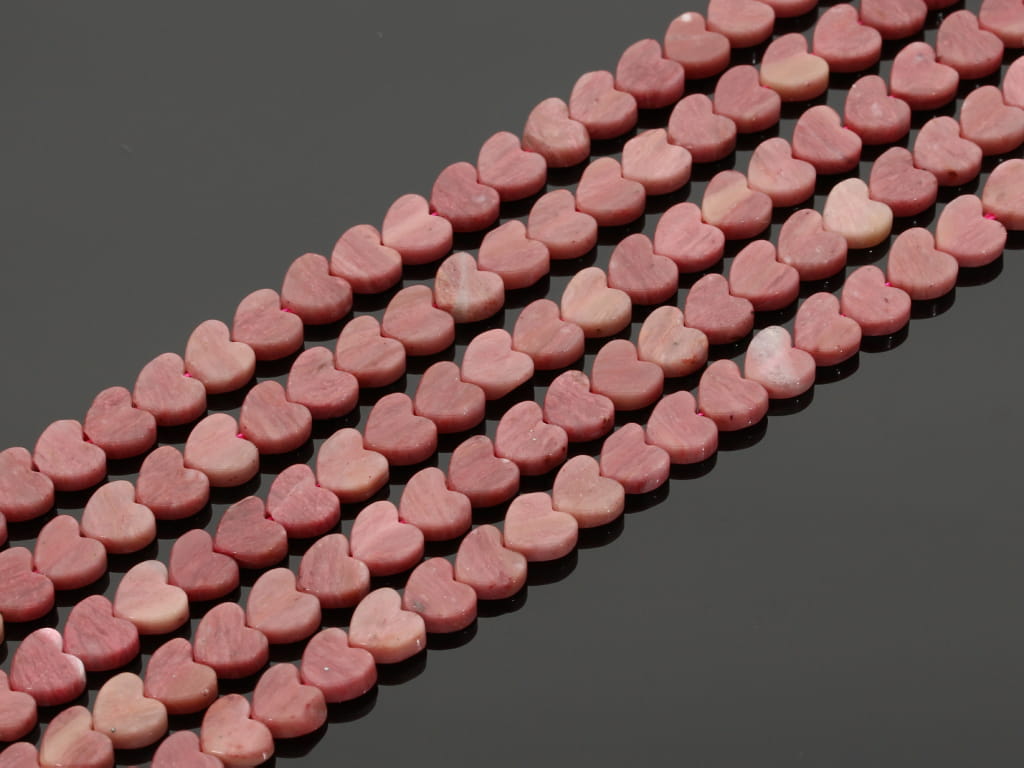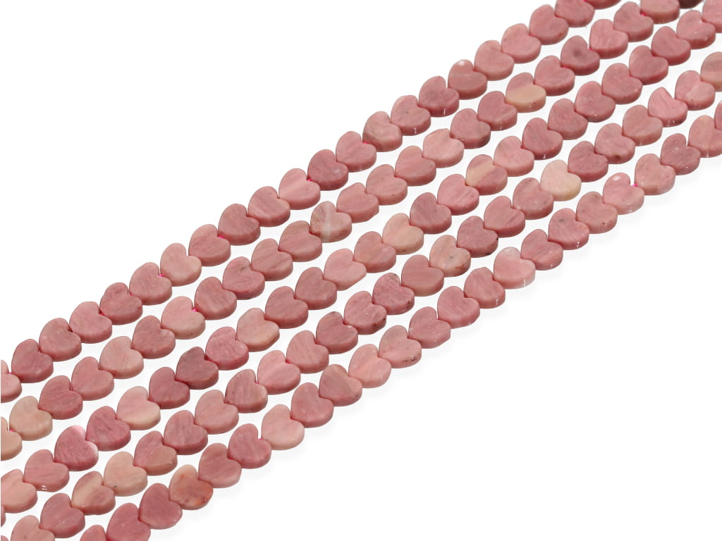 Rodonit w kształcie serca, sprzedawany w sznurach bez zapięcia, służących do samodzielnego tworzenia biżuterii. Cena dotyczy jednego sznura, który podczas kompletowania zamówienia jest wybierany losowo.