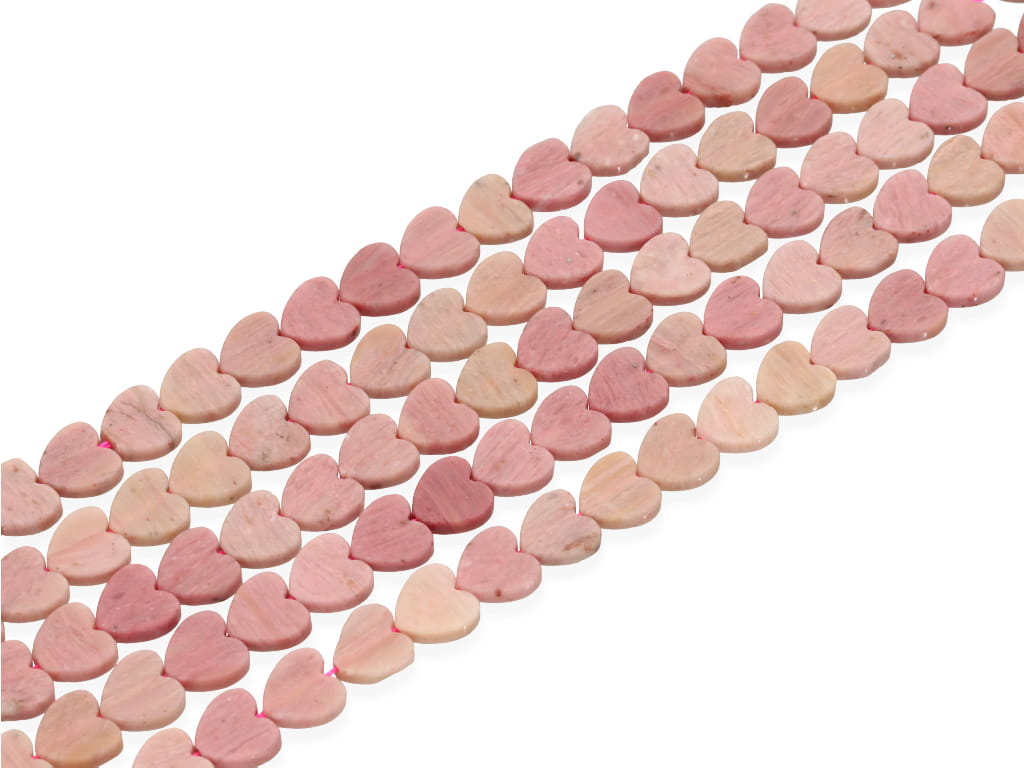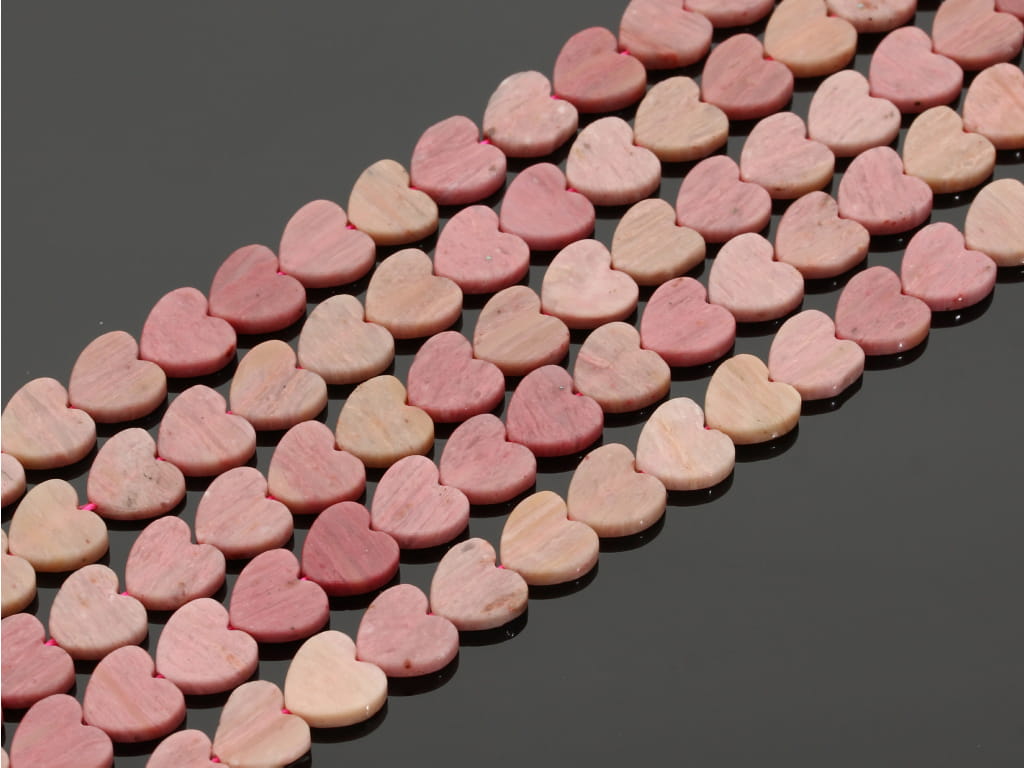 Rodonit w kształcie serca, sprzedawany w sznurach bez zapięcia, służących do samodzielnego tworzenia biżuterii. Cena dotyczy jednego sznura, który podczas kompletowania zamówienia jest wybierany losowo.