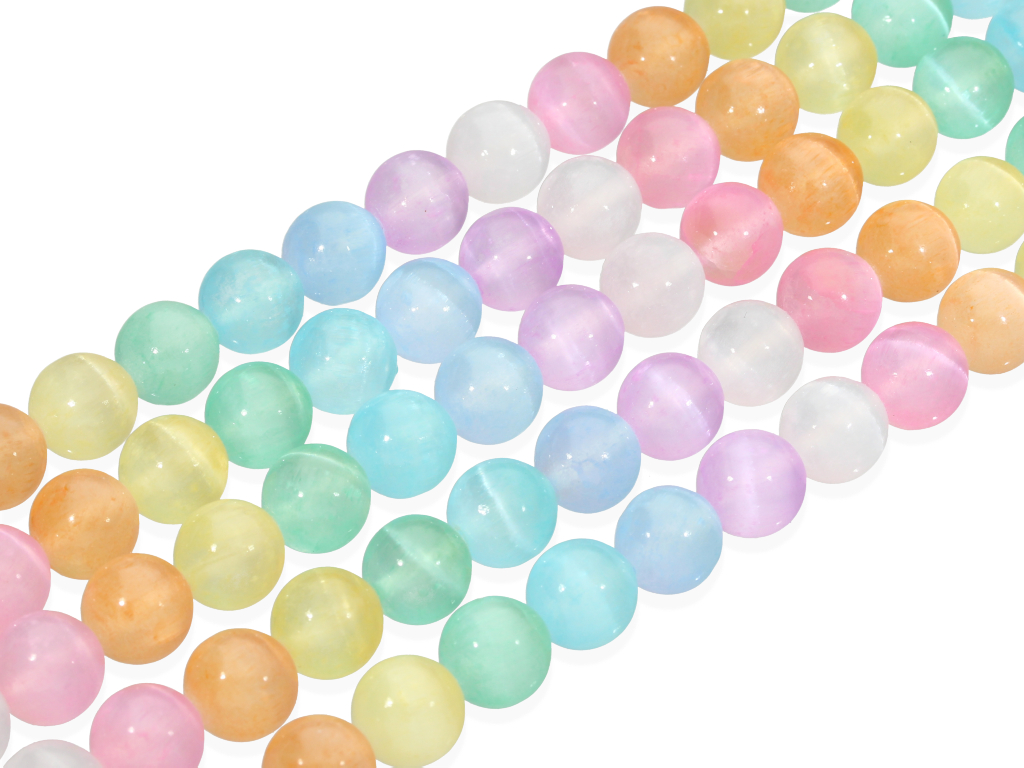 Selenit w kształcie kulki, sprzedawany w sznurach bez zapięcia, służących do samodzielnego tworzenia biżuterii. Cena dotyczy jednego sznura, który podczas kompletowania zamówienia jest wybierany losowo.