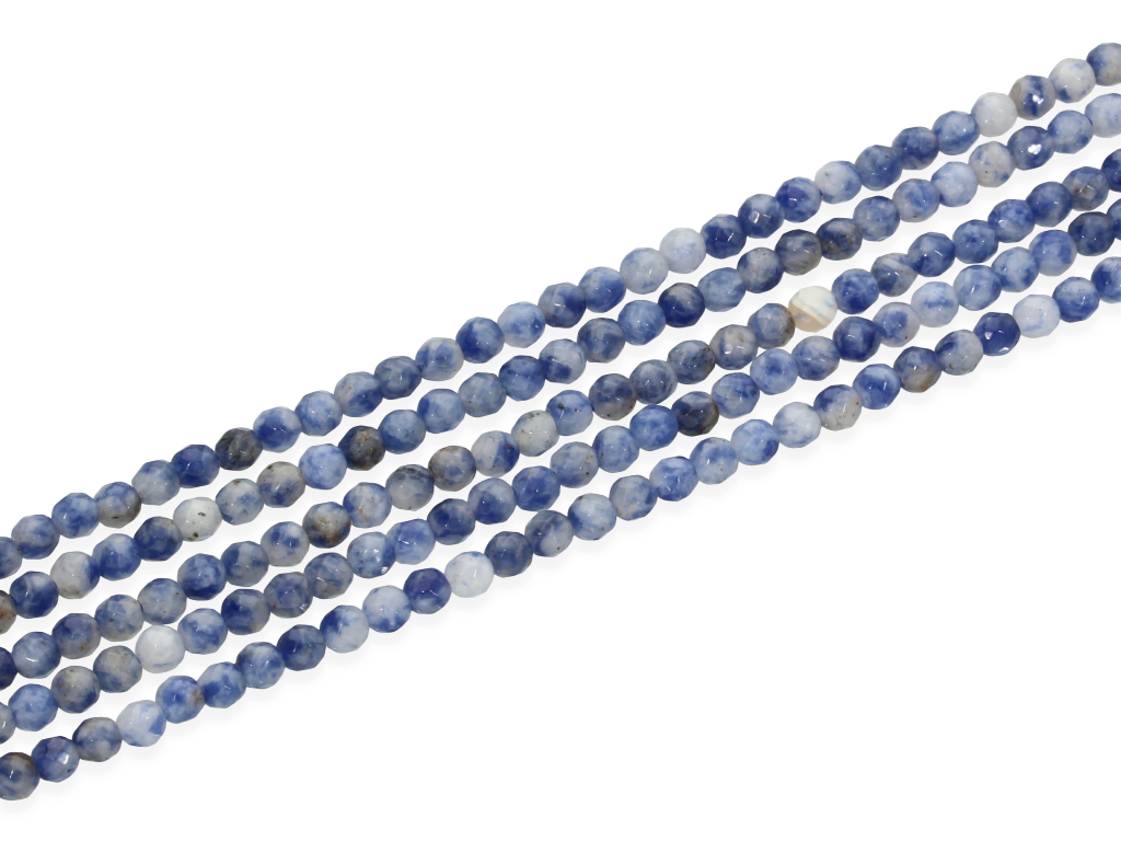 Sodalit w kształcie fasetowanej kulki, sprzedawany w sznurach bez zapięcia, służących do samodzielnego tworzenia biżuterii. Cena dotyczy jednego sznura, który podczas kompletowania zamówienia jest wybierany losowo.
