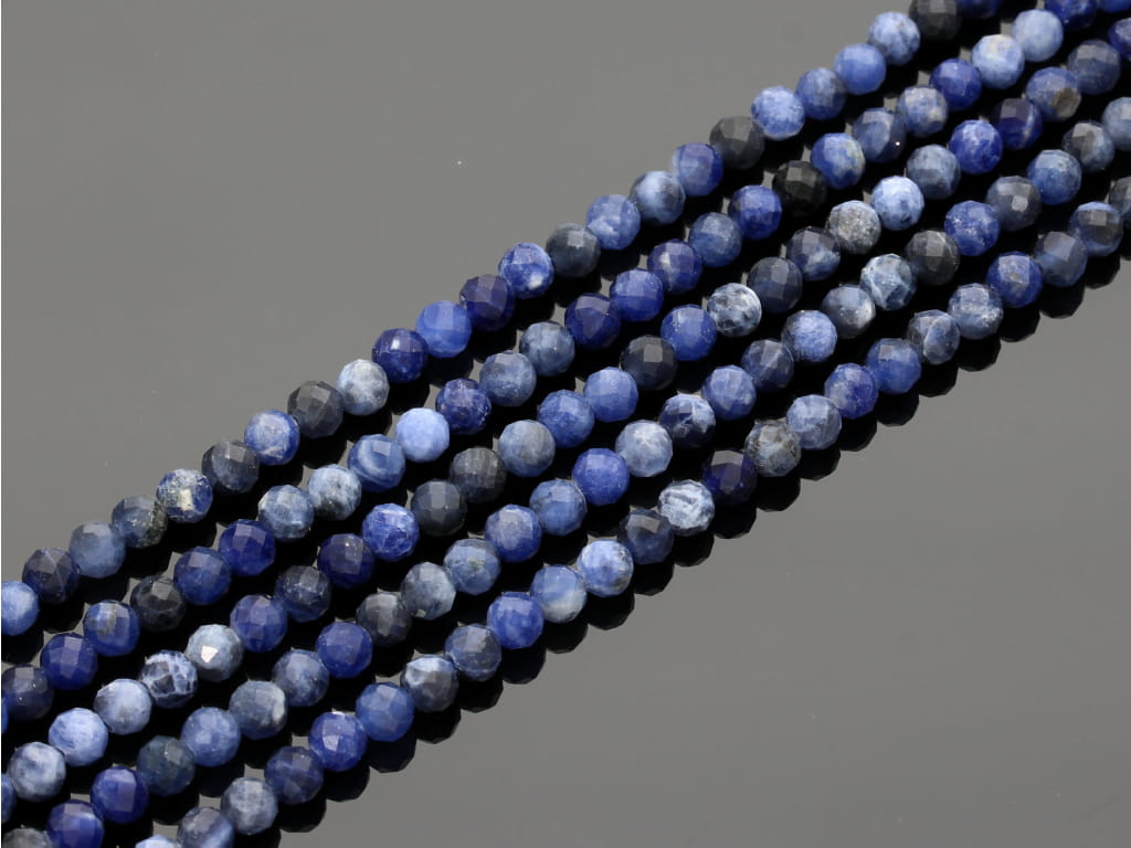 Sodalit w kształcie fasetowanej kulki, sprzedawany w sznurach bez zapięcia, służących do samodzielnego tworzenia biżuterii. Cena dotyczy jednego sznura, który podczas kompletowania zamówienia jest wybierany losowo.