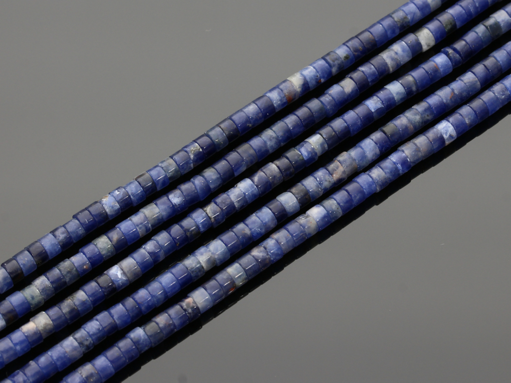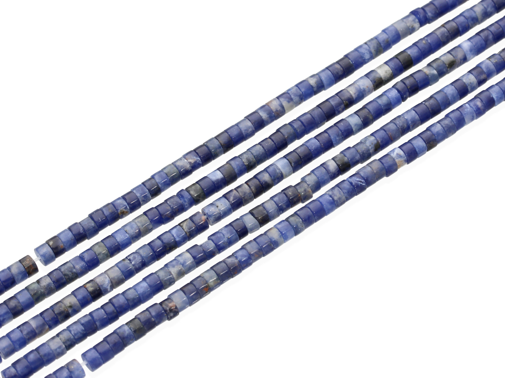 Sodalit w kształcie plasterków, sprzedawany w sznurach bez zapięcia, służących do samodzielnego tworzenia biżuterii. Cena dotyczy jednego sznura, który podczas kompletowania zamówienia jest wybierany losowo.