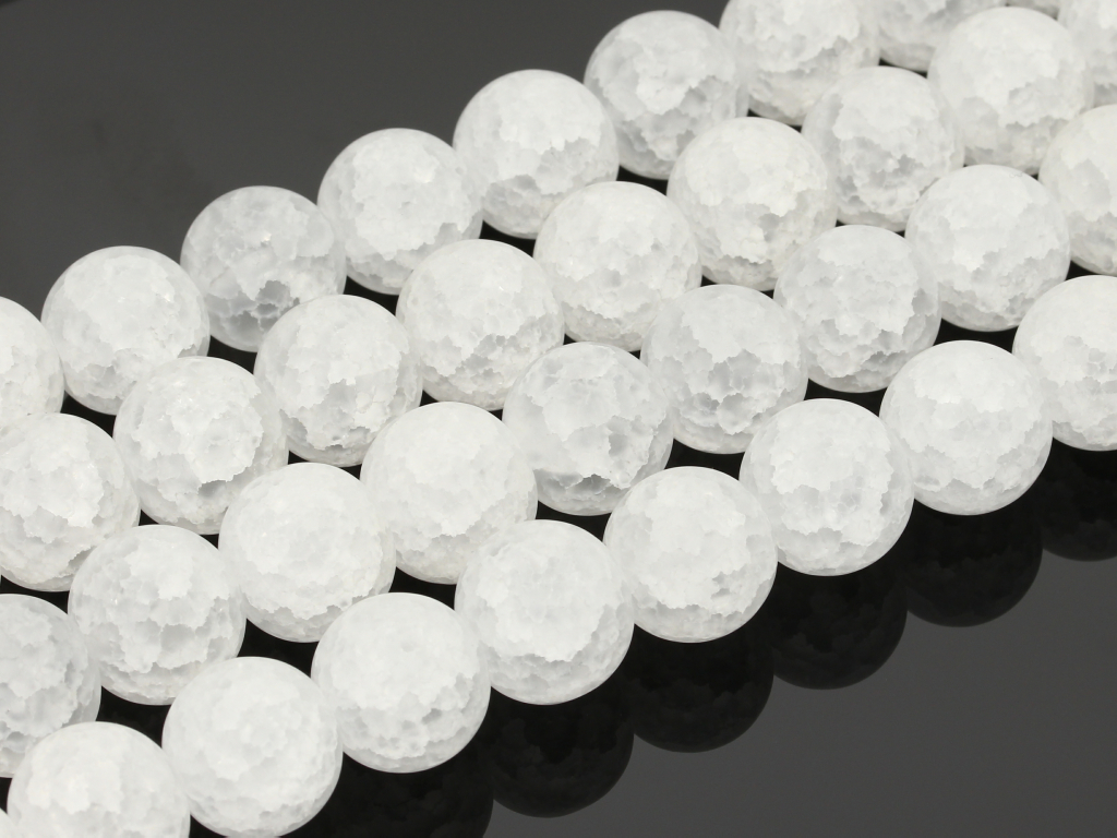 Mrożone szkło crackle imitujące kryształ górski w kształcie kulki, sprzedawane w sznurach bez zapięcia, służących do samodzielnego tworzenia biżuterii. Cena dotyczy jednego sznura o długości ~ 19 cm, który podczas kompletowania zamówienia jest wybierany losowo.