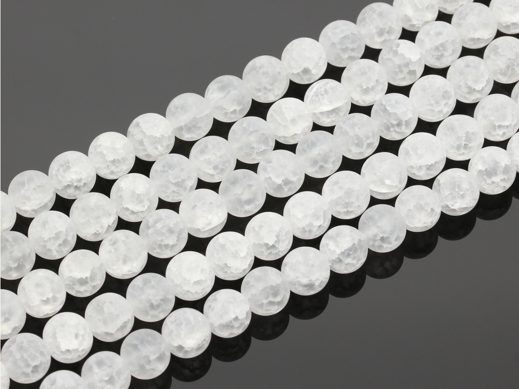 Mrożone szkło crackle imitujące kryształ górski w kształcie kulki, sprzedawane w sznurach bez zapięcia, służących do samodzielnego tworzenia biżuterii. Cena dotyczy jednego sznura o długości ~ 20 cm, który podczas kompletowania zamówienia jest wybierany losowo.