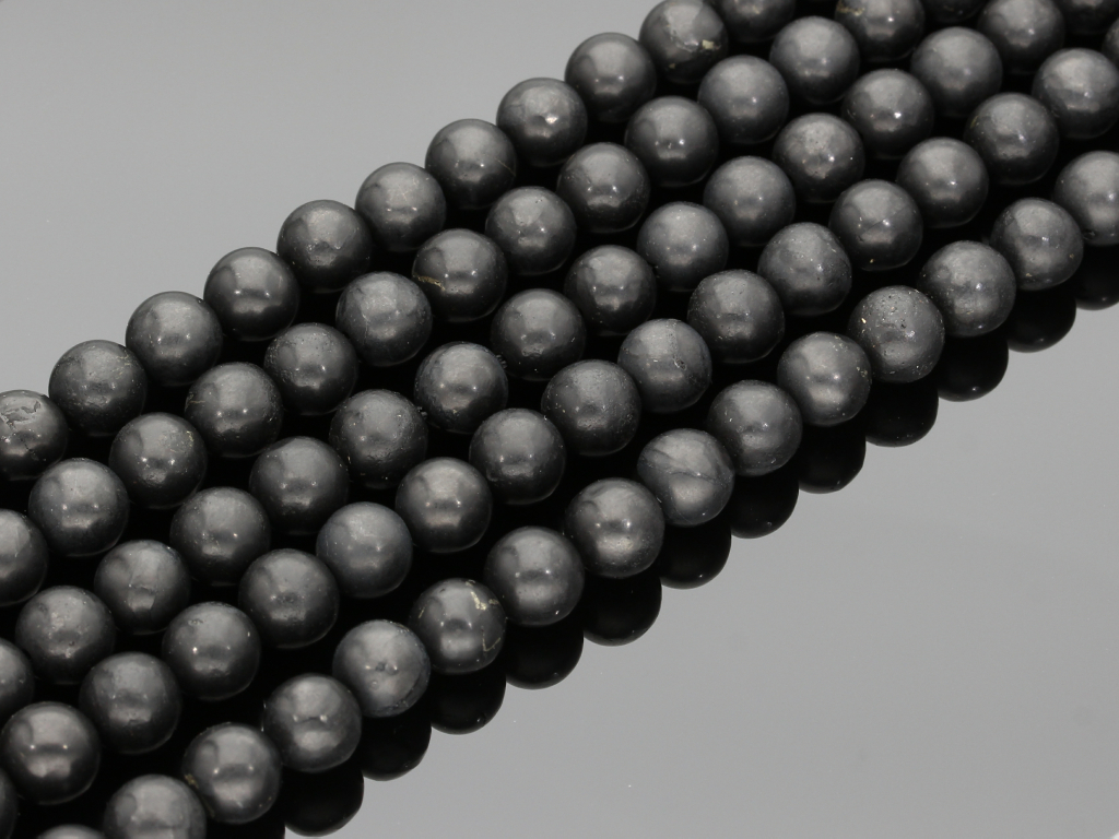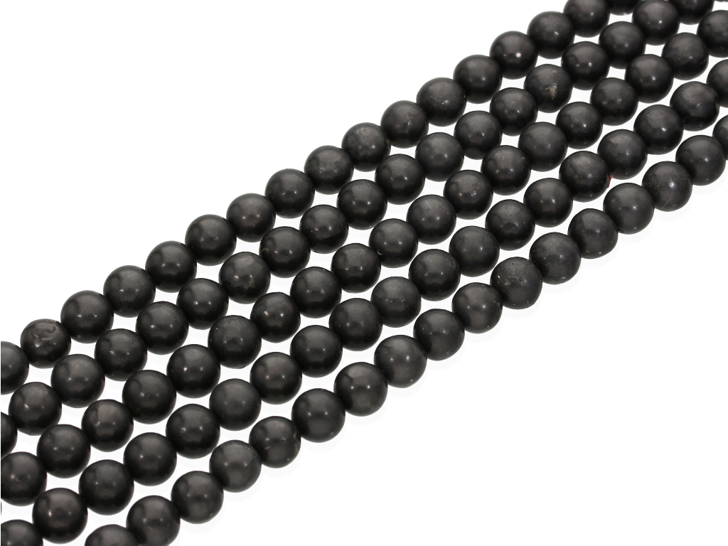 Szungit w kształcie kulki, sprzedawany w sznurach bez zapięcia, służących do samodzielnego tworzenia biżuterii. Cena dotyczy jednego sznura, który podczas kompletowania zamówienia jest wybierany losowo.