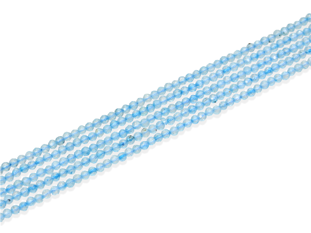 Topaz niebieski w kształcie fasetowanej kulki, sprzedawany w sznurach bez zapięcia, służących do samodzielnego tworzenia biżuterii. Cena dotyczy jednego sznura, który podczas kompletowania zamówienia jest wybierany losowo.