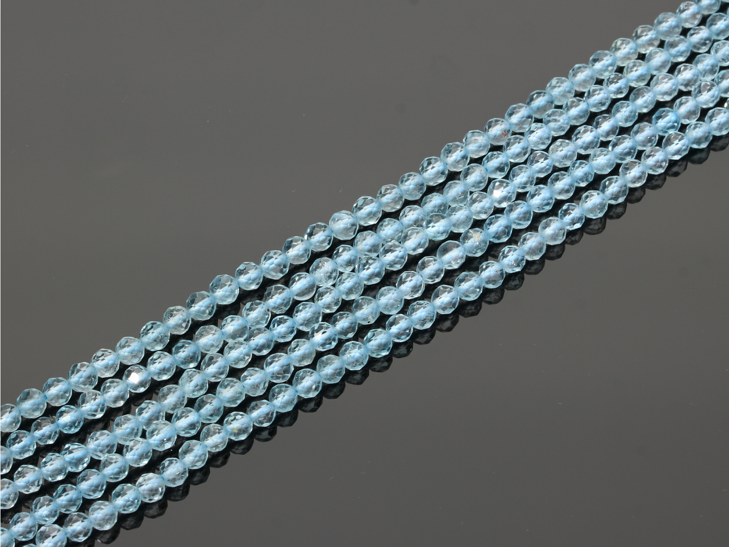 Topaz niebieski gradacji jakościowej AAA w kształcie fasetowanej kulki, sprzedawany w sznurach bez zapięcia, służących do samodzielnego tworzenia biżuterii. Cena dotyczy jednego sznura, który podczas kompletowania zamówienia jest wybierany losowo.