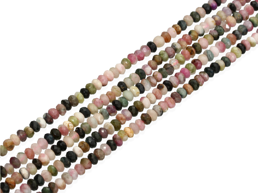 Turmalin w kształcie fasetowanej oponki, sprzedawany w sznurach bez zapięcia, służących do samodzielnego tworzenia biżuterii. Cena dotyczy jednego sznura, który podczas kompletowania zamówienia jest wybierany losowo.