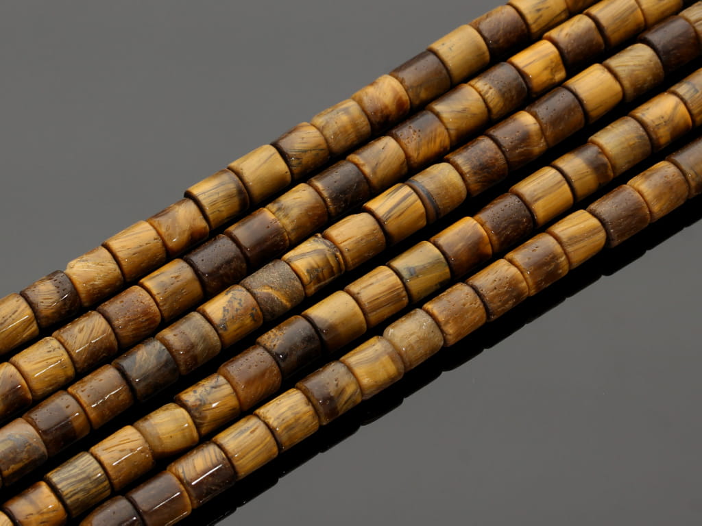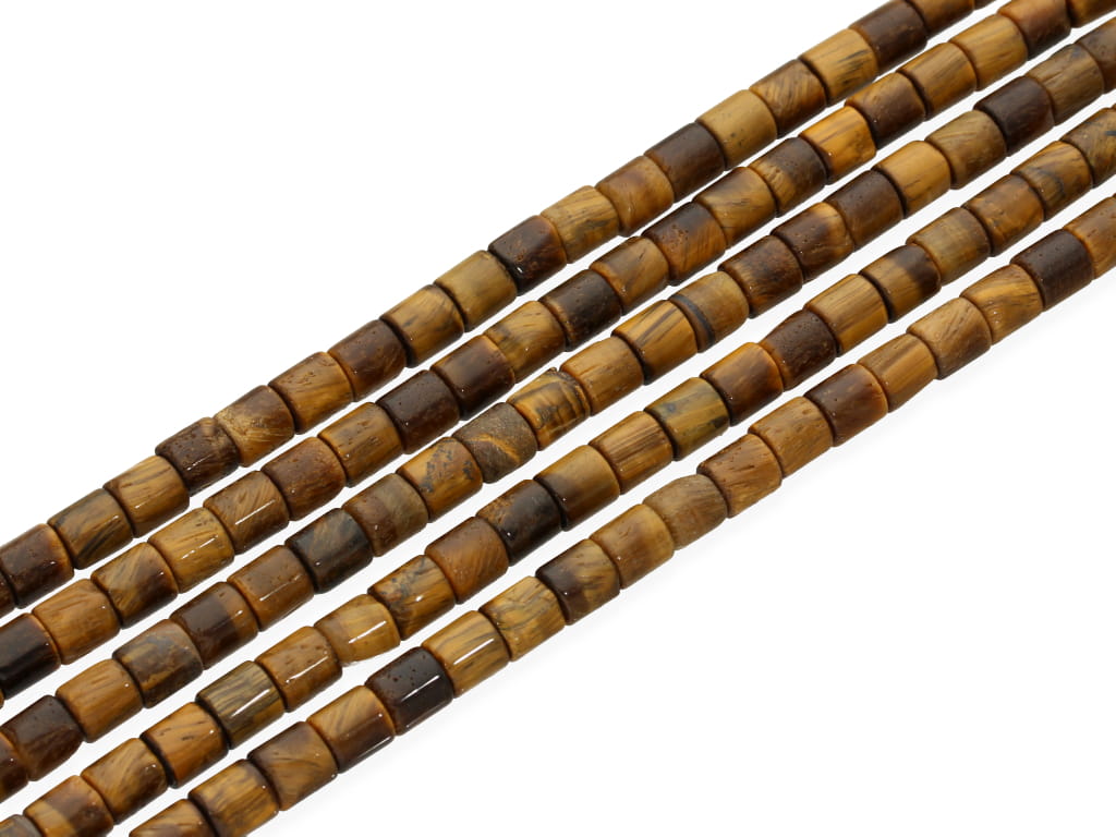 Tygrysie oko w kształcie walca, sprzedawane w sznurach bez zapięcia, służących do samodzielnego tworzenia biżuterii. Cena dotyczy jednego sznura, który podczas kompletowania zamówienia jest wybierany losowo.